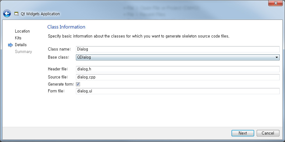 Class Information 에서는 간단하게 응용프로그램을 작성하기 위해 Bass class 를 QWidget 으로 선택합니다.