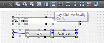 Label 과 Line Edit 을 묶은 Layout 과, Horizontal Spacer 와 Push Button 컨트롤 2개를 묶은 Layout 을 선택하여 Layout Vertically 를 선택합니다.
