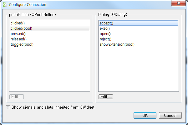 accept 시그널은 QWidget 에는 제공되지 않으므로 QDialog 가 아니면 보이지 않을 수 있습니다.