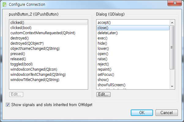 시그널 앤 슬롯을 추가하여 OK 인 경우 accept 시그널을 Cancel 인 경우 close 시그널을 추가합니다.