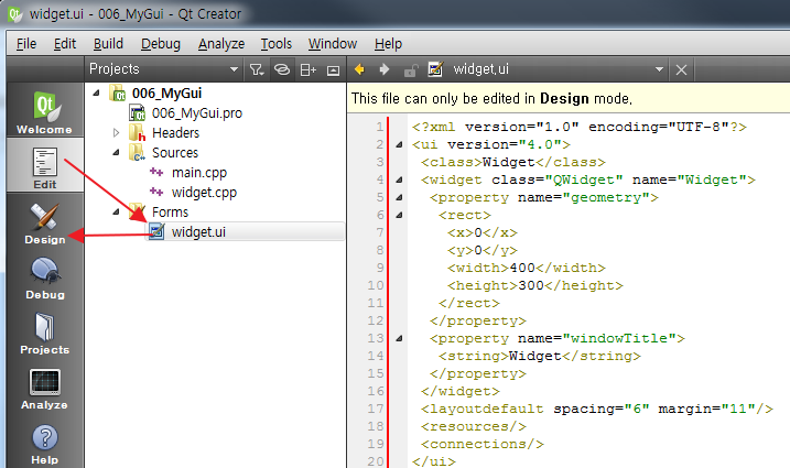 Forms 에 있는 widget.ui 를 더블 클릭하여 QT 디자이너를 엽니다.