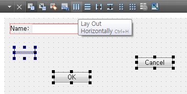 Push Button 두개의 컨트롤과 이 Spacer 를 선택한 후 Layout Horizontally 를 선택합니다.