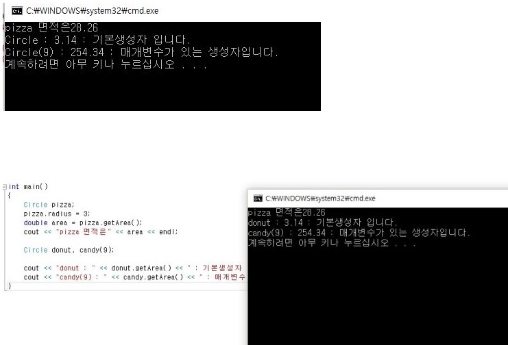cout << "Circle(9) : " << Circle(9).getArea() << " : 매개변수가 있는 생성자입니다." << endl;