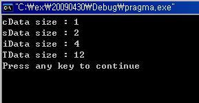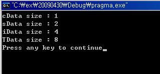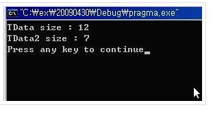 TEST 구조체 변수인 TData는 char형 데이터(1byte), short형 데이터(2byte), int형 데이터(4byte)를 가지고 있으므로 1+2+4=7byte의 크기를 가질 것 처럼 보인다. 하지만 이 소스를 컴파일하고 실행을 해보면 다음과 같은 결과가 나온다.
