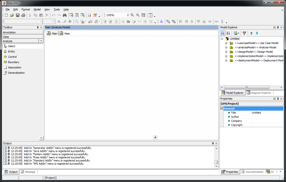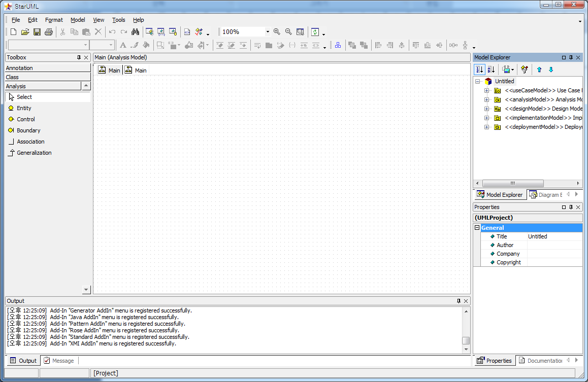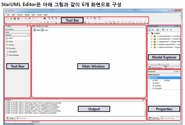 StarUML Editor은 아래 그림과 같이 6개 화면으로 구성