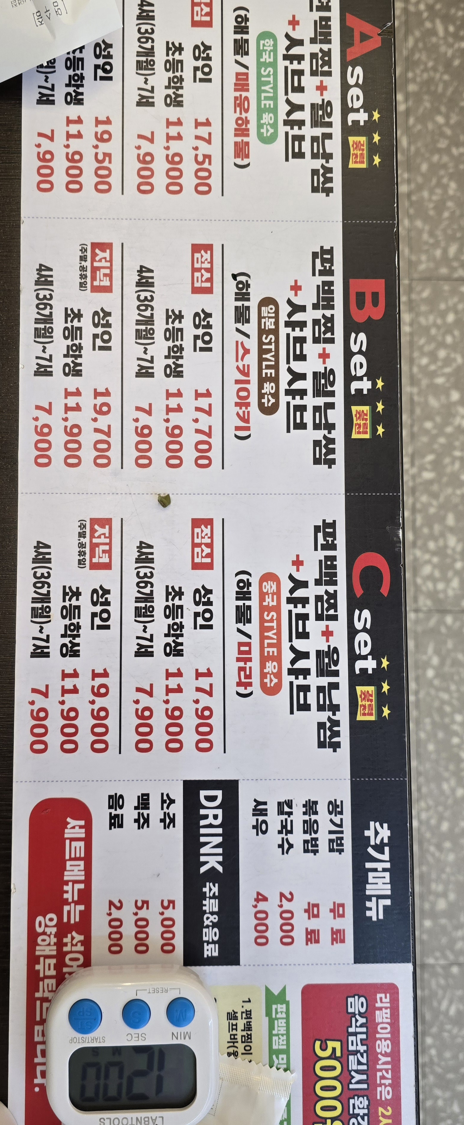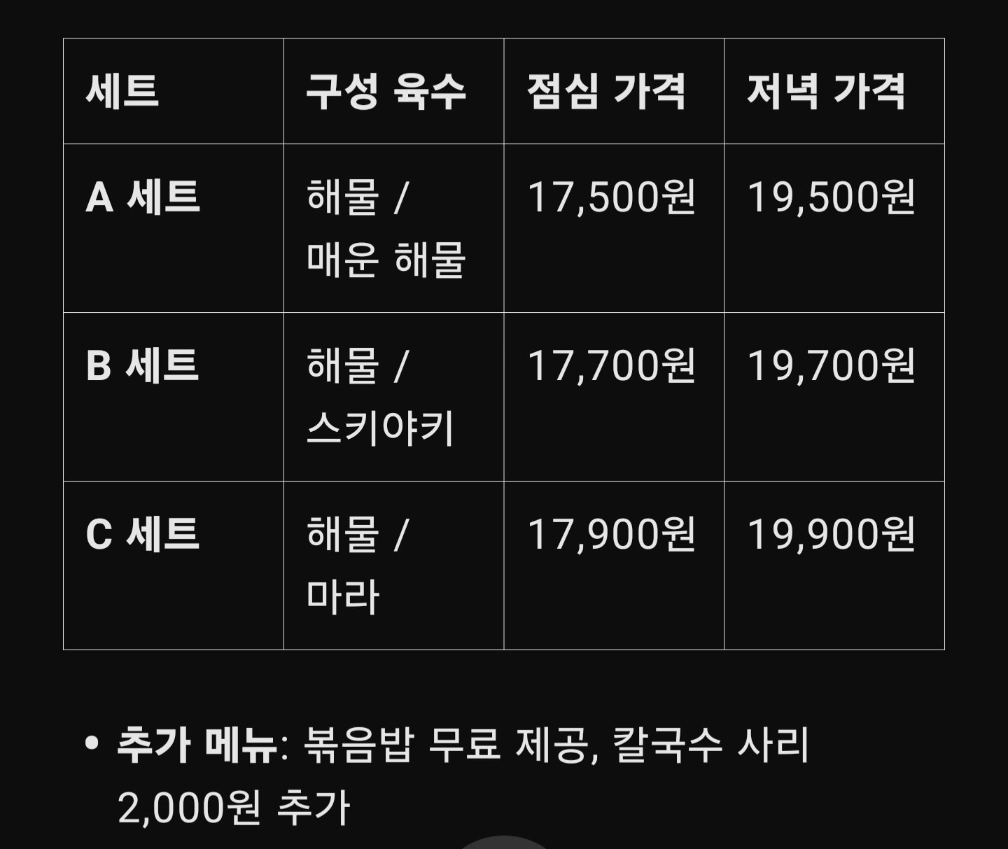 추가 메뉴: 볶음밥 무료 제공, 칼국수 사리 2,000원 추가