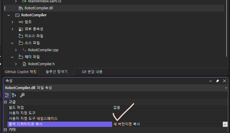 13. RobotCompiler.dll의 속성 출력디렉터리로복사를 새버전이면복사로 변경