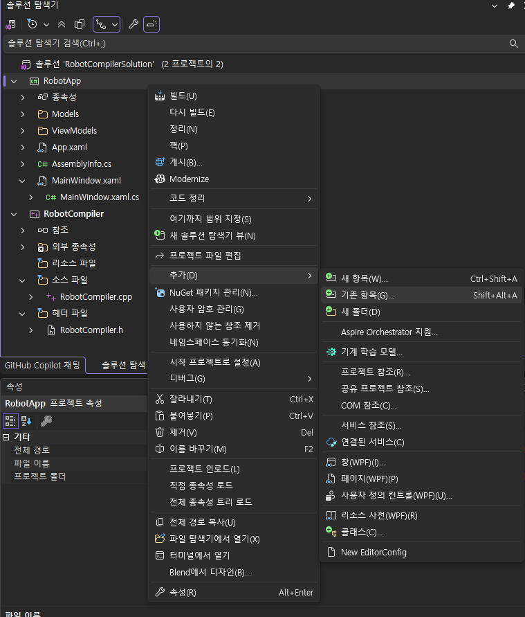 RobotApp 우클릭 -> 추가 -> 기존항목