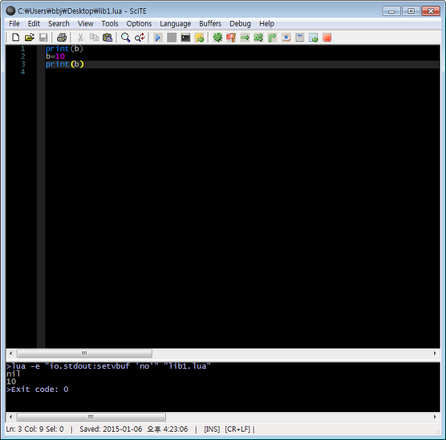 - 아래와 같이 파일을 작성하고 lib1.lua 로 C:\에 저장한다.